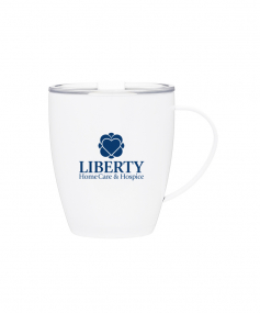 12 oz double wall 18/8 stainless steel thermal mug with copper vacuum insulation, clear acrylic push-on lid, and matching swivel; Hand wash recommended; Do not microwave; 4-7/16" h x 4"w (4-7/8 with handle) ; 355mL.