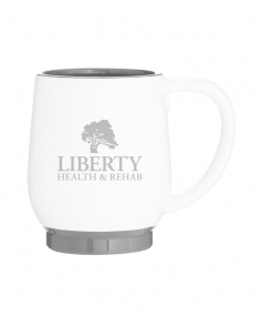 12 oz stoneware: matte white out / glossy color in with speckles and colored base. Hand wash recommended. Do not microwave with metallic imprint (glitz). Complies with FDA, Prop 65. 4.4375" H x 3.625" W