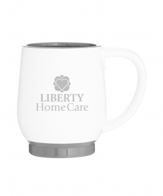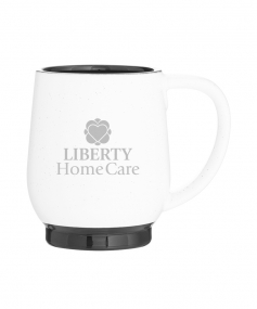 12 oz stoneware: matte white out / glossy color in with speckles and colored base. Hand wash recommended. Do not microwave with metallic imprint (glitz). Complies with FDA, Prop 65. 4.4375" H x 3.625" W