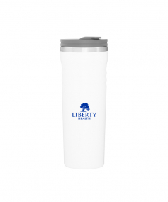 16.9 oz double wall tumbler with 18/8 stainless steel inner wall, stainless steel outer wall, vacuum insulation, push-on lid, swivel closure, stainless steel rim, and powder coated finish