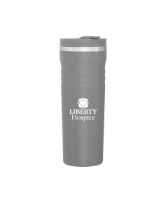 16.9 oz double wall tumbler with 18/8 stainless steel inner wall, stainless steel outer wall, vacuum insulation, push-on lid, swivel closure, stainless steel rim, and powder coated finish