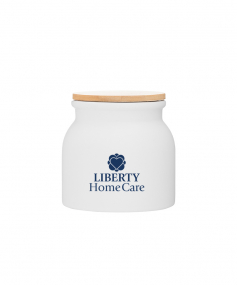 16.9 oz stoneware: matte white out / glossy white in with push-on bamboo lid; Hand wash recommended; Microwave safe with non-metallic imprint; 4 3/16 h x 4 3/16 (w/handle) w ; 500mL.