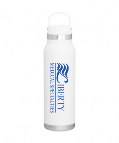 25 oz double wall 18/8 stainless steel thermal bottle with copper vacuum insulation, threaded insulated lid with carrying handle, high polish accent, stainless steel base, and powder coated finish. Hand wash recommended; Do not microwave. Dimensions: 10 H x 3".