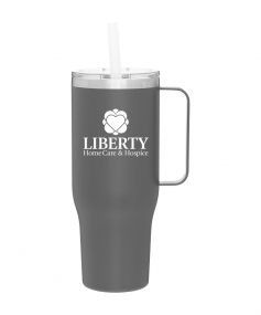 40 oz double wall 18/8 stainless steel thermal mug with copper vacuum insulation, stainless steel rim, dual-purpose push-on clear lid, matching sliding closure, flexible wide silicone straw, and powder coated finish. Individual gift box. Hand wash recommended. Do not microwave. Complies with FDA, Prop 65. 9.75" H x 4" W