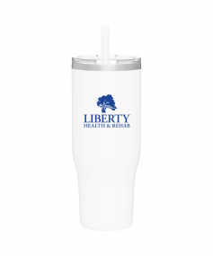 40 oz double wall 18/8 stainless steel thermal tumbler with copper vacuum insulation, stainless steel rim, dual-purpose push-on clear lid, matching sliding closure, flexible wide silicone straw, and powder coated finish