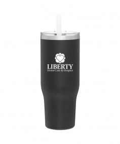 40 oz double wall 18/8 stainless steel thermal tumbler with copper vacuum insulation, stainless steel rim, dual-purpose push-on clear lid, matching sliding closure, flexible wide silicone straw, and powder coated finish