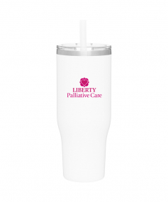 40 oz double wall 18/8 stainless steel thermal tumbler with copper vacuum insulation, stainless steel rim, dual-purpose push-on clear lid, matching sliding closure, flexible wide silicone straw, and powder coated finish