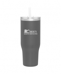 40 oz double wall 18/8 stainless steel thermal tumbler with copper vacuum insulation, stainless steel rim, dual-purpose push-on clear lid, matching sliding closure, flexible wide silicone straw, and powder coated finish