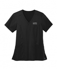 This v-neck top features a 78/20/2 poly/rayon/spandex blend, front princess seams, a shoulder badge loop and top loading front pockets.